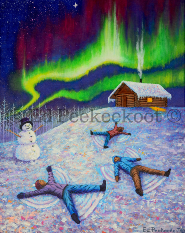 I was in awe. I felt excited, happy, and a little afraid at the same time. This one winter, me and my cousins were out after supper playing a game of tag called Fox and Geese in the snow that had fallen earlier in the day. The sky had cleared, and, on the horizon, we could see Northern Lights beginning to show.